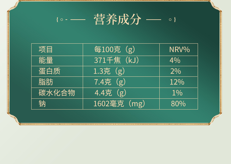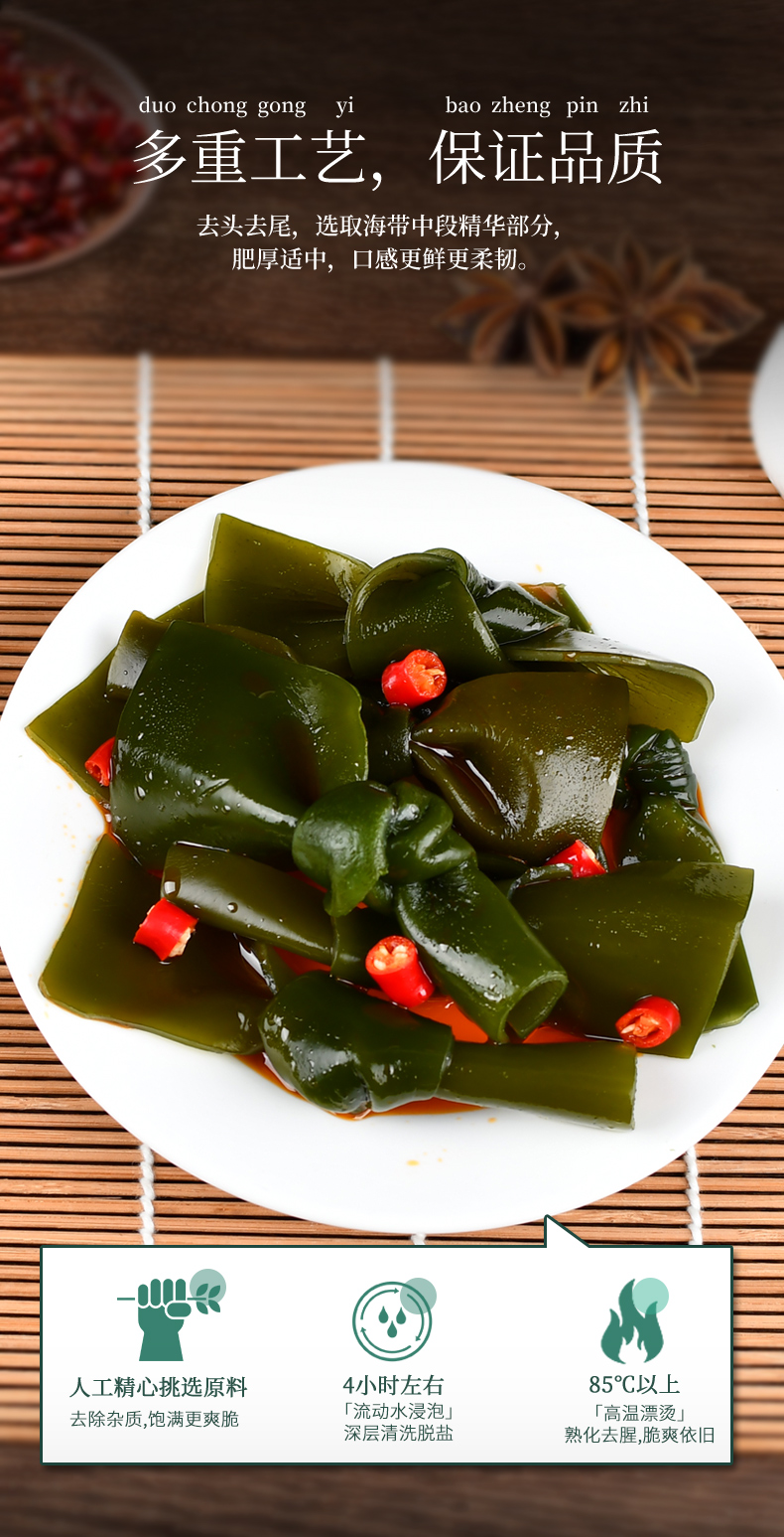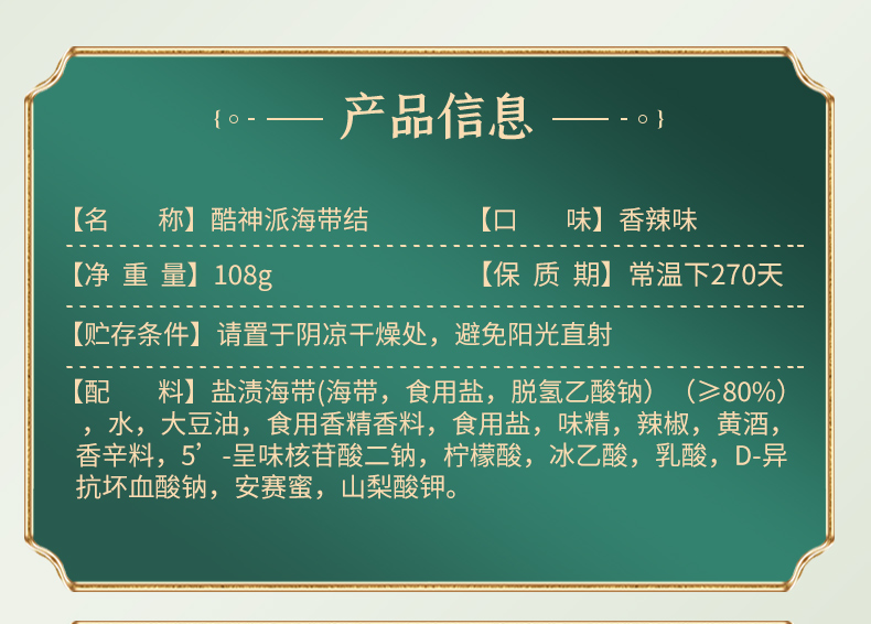 鹽漬海帶(海帶,食用鹽,脫氫乙酸鈉)(≥80%),水,大豆油,食用香精香料,食用鹽,味精,辣椒,黃酒,香辛料,5’-呈味核苷酸二鈉,檸檬酸,冰乙酸,乳酸,D-異抗壞血酸鈉,安賽蜜,山梨酸鉀。