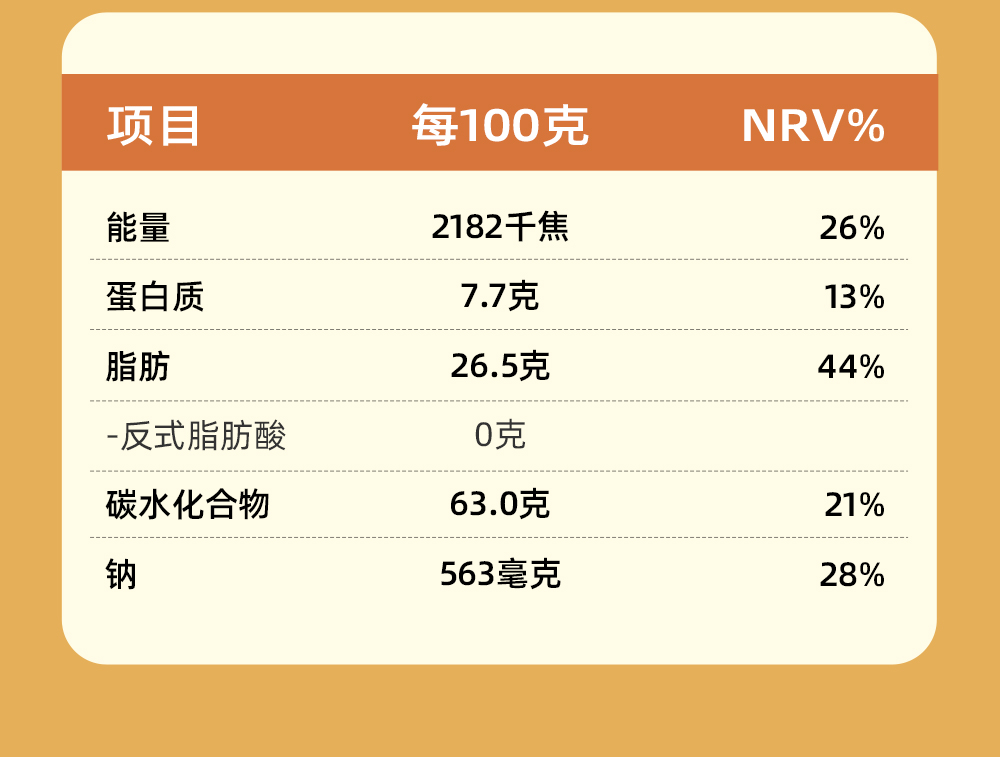 小麥粉、植物油、白砂糖、干酪粉、雞蛋、 食用鹽、脫脂乳粉、碳酸氫鈉。