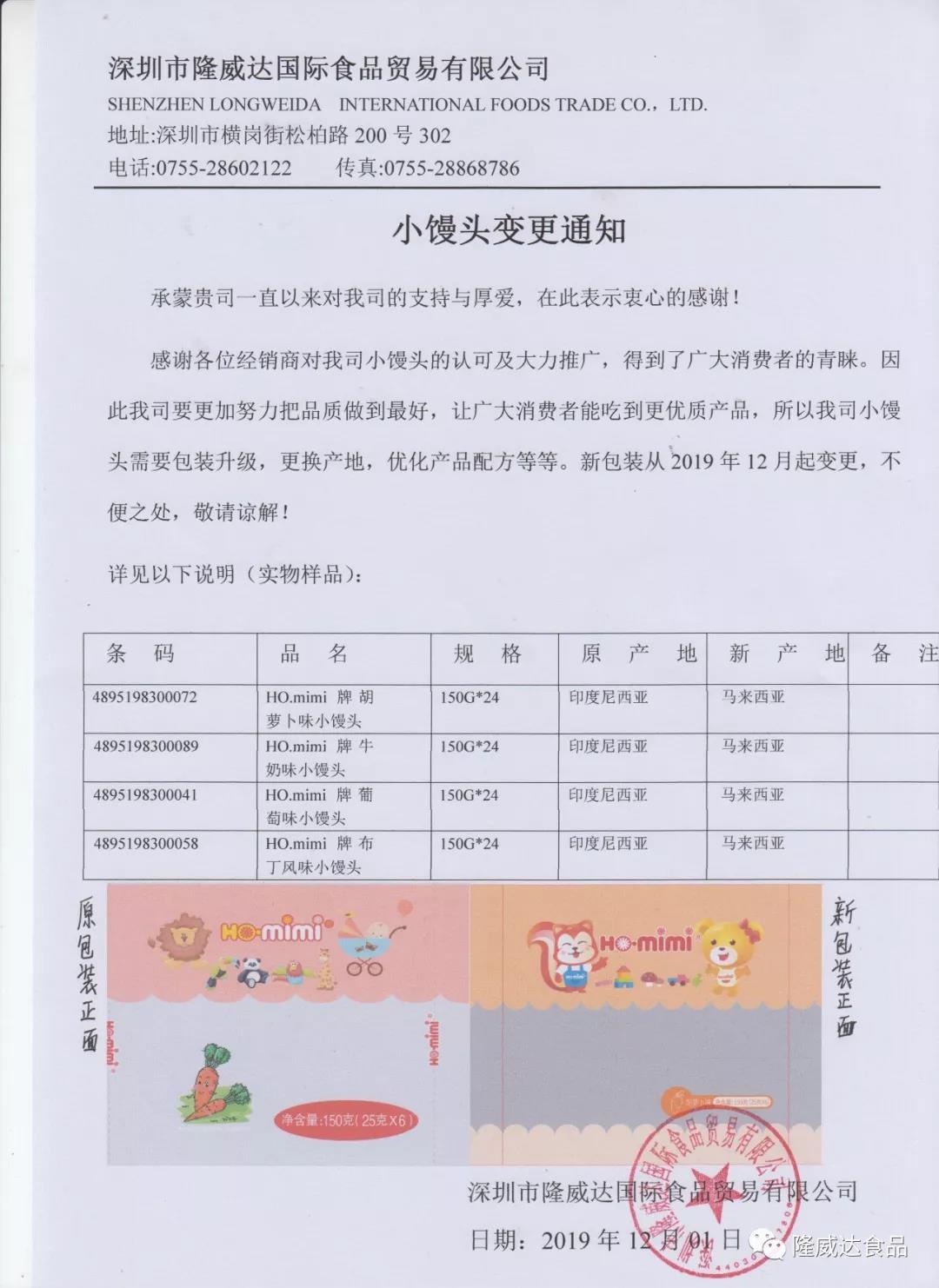 關于本公司HO.mimi牌150g小饅頭的變更通知